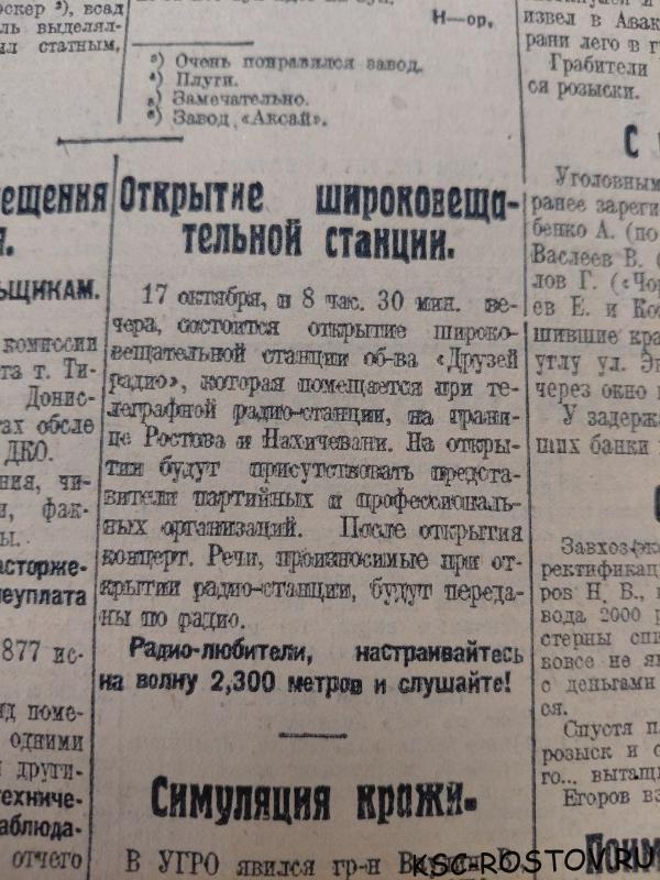 17 октября 1925 года в вечернем номере газеты «Молот» появилась короткая заметка: «Сегодня в 8 часов 20 минут вечера состоится открытие широковещательной станции Общества «Друзей радио», помещающейся при телеграфной станции на границе Ростова и Нахичевани. После открытия — концерт. Радиолюбители, настраивайтесь на волну 2300 метров и слушайте». Так началась история ростовского радио — одной из старейших вещательных студий страны.