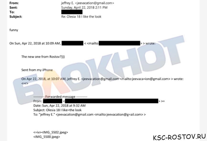 В другом документе была информация о 18-летней ростовчанке Олесе. Джеффри в переписке с неизвестным ответил на письмо с темой «Re: Olesia 18 I like the look» (Олеся 18 мне нравится как она выглядит).