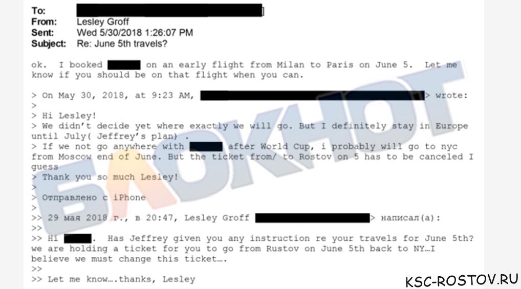 Отметим, что эта девушка вела дополнительную переписку с Лесли Гроф – экс-помощницей Джеффри Эпштейна, которая фигурировала в судебных исках, связанных с обвинениями в содействии сексуальному насилию. Так, в этой переписке дончанка говорила, что билеты на самолет в Америку нужно перенести, так как «согласно плану Джеффри» они планируют подольше задержаться в Европе.