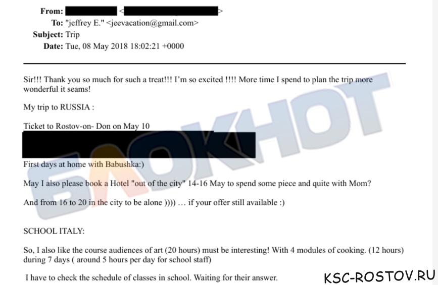 В другом документе была информация о 18-летней ростовчанке Олесе. Джеффри в переписке с неизвестным ответил на письмо с темой «Re: Olesia 18 I like the look» (Олеся 18 мне нравится как она выглядит).