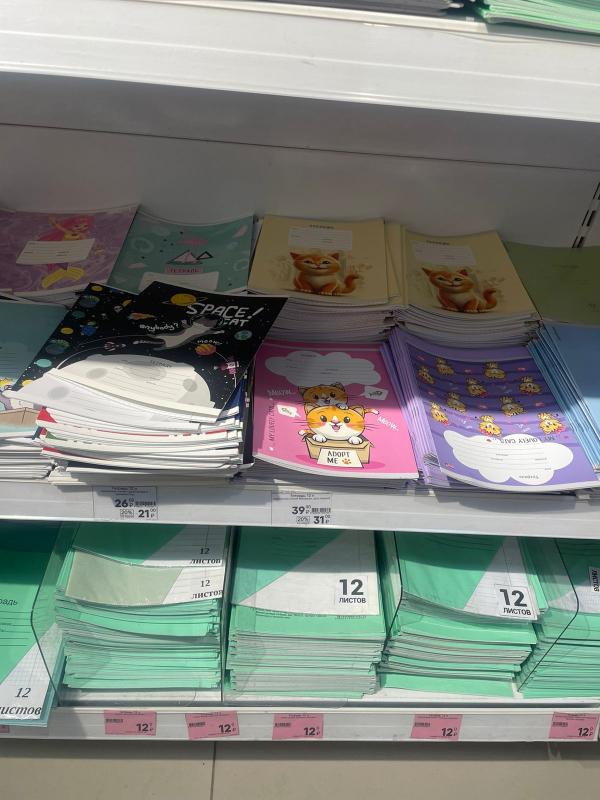 Следом идут канцелярские принадлежности. В магазине, среди привычных полок с весёлыми принтами и яркой упаковкой, лежат тетради: с изображением мультгероев — 39 рублей, обычные – всего 12 рублей. Потом кисточки: от самых тонких – 59 рублей, до фирменных плотных – 239 рублей. Гуашь тоже «на любой вкус» – от базовых 89 рублей до подготовочной палитры за 429 рублей.