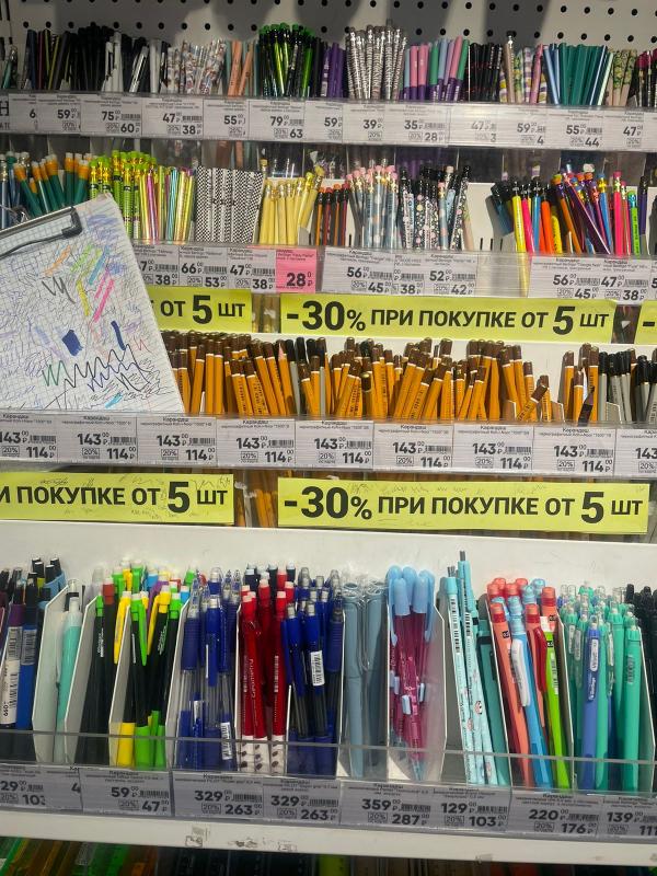 Наборы карандашей – от 239 до 679 рублей, в зависимости от количества и качества. Клей-карандаш средний – где-то 145-155 рублей, корректоры – от 83 до 175 рублей. Линейка – от 46 до 119 рублей. А точилка? Простенькая – 129 рублей, а за более «стильную» просят 329 рублей. Если покупать карандаши сразу десятками, акция позволяет получить цену от 28 до 146 рублей за штуку, в зависимости от скидочного купона.