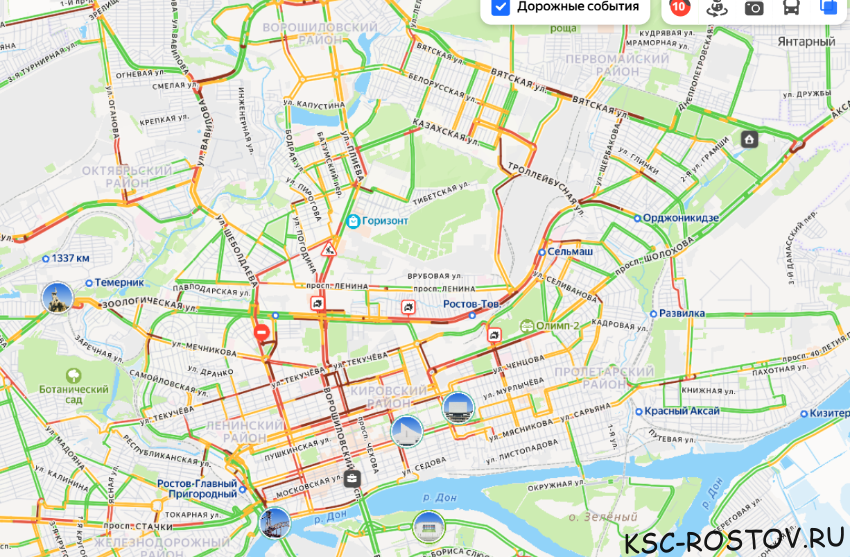 На фоне сильного снегопада в Ростове, пробки в городе достигли 10 баллов, согласно Яндекс Картам.